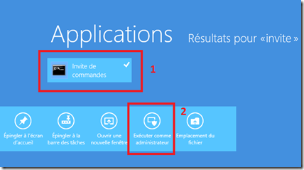 1- Ouvrez une invite de commandes en tant qu’administrateur (sous Windows 8, touche Windows, puis tapez “invite de commandes”, clic droit dessus puis “Exécuter en tant qu’administrateur”) :